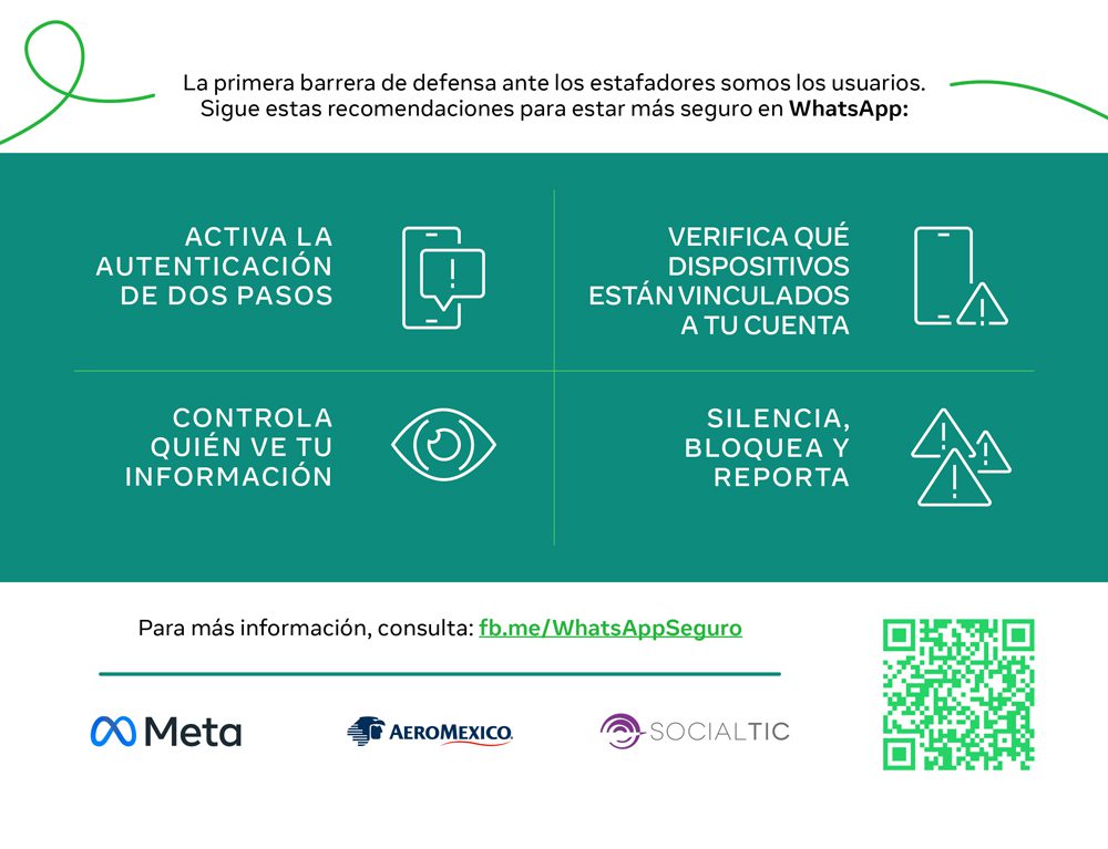 Unimos esfuerzos con Meta y Aeroméxico, para lanzar esta campaña orientada a promover recomendaciones y herramientas de seguridad en línea, especialmente en Facebook, Instagram y WhatsApp. La iniciativa tiene el objetivo de ayudar a las personas a configurar sus cuentas para que sean más seguras y privadas, así como a prevenir y reportar intentos de fraude, incluyendo los relacionados con la venta de viajes y boletos de avión.