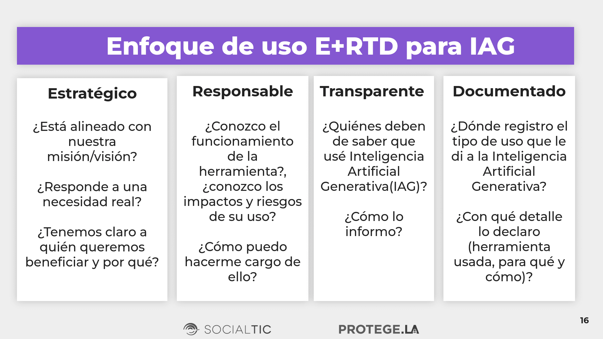 Aunque está pensado para la educación, consideramos que el enfoque tiene potencial para otros ámbitos, como el de las OSC. Por ello, lo adaptamos añadiéndole un elemento más que consideramos clave para el sector social: el estratégico. Buscamos con ello hacer una pausa y evitar la adopción irreflexiva de una tecnología solo para “no quedarse atrás” o subirse a una tendencia “inevitable”, sino procurar que sea porque obedece a nuestra misión y nos acerca a los objetivos que perseguimos. Queda entonces la propuesta E+RTD: estratégico, responsable, transparente y documentado.